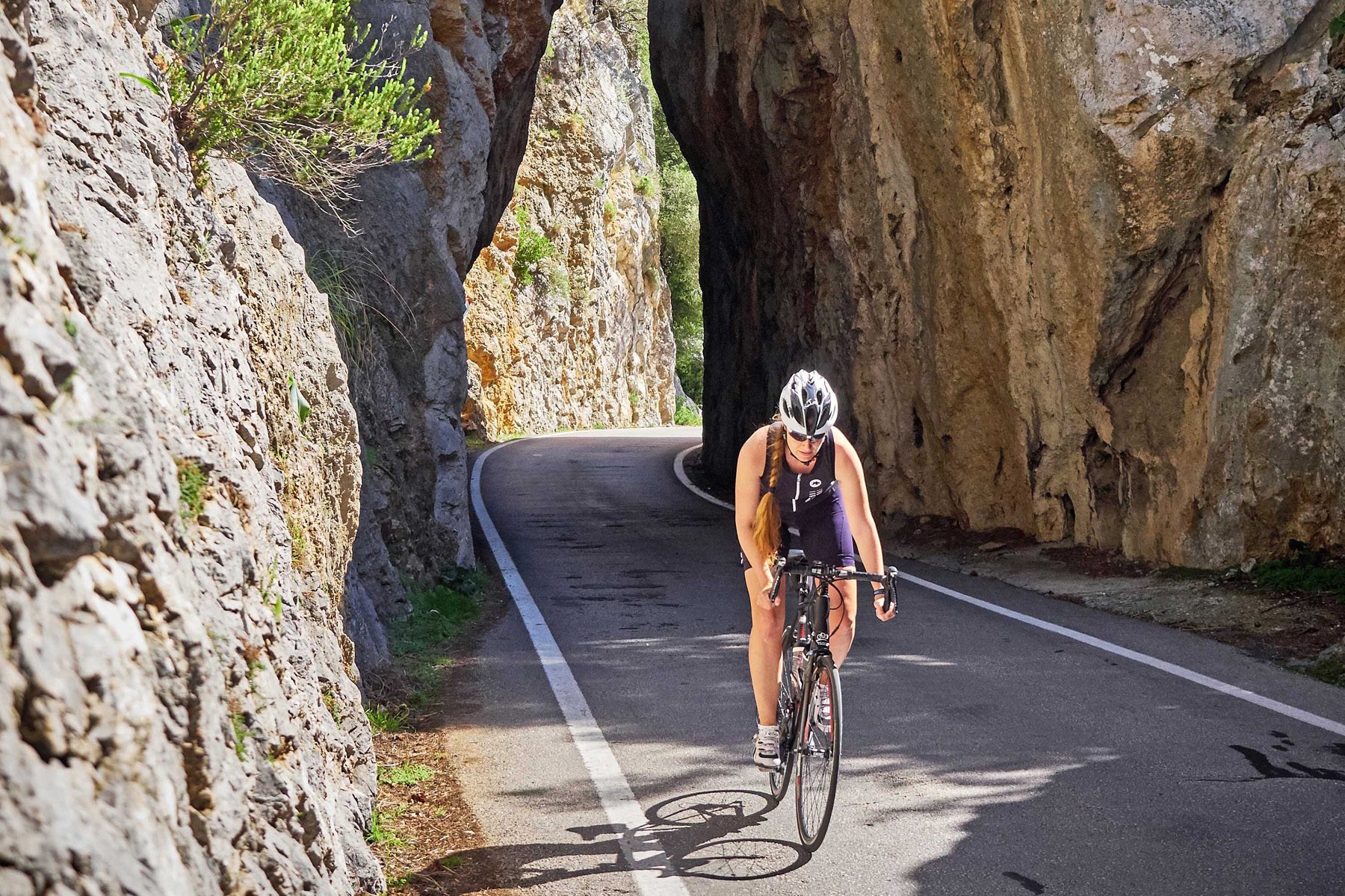 The switchbacks here reward every effort with views that get bigger and bolder the higher you go. From the top, the Dragon’s Tail delivers classic Mallorca riding—rollers, ridgelines, tunnels, sweeping corners—and before long you’re standing at the Formentor Lighthouse, grinning at what you’ve just accomplished. The descent is pure joy, dropping you neatly toward Formentor Beach, where a cold drink and a salty breeze reset the legs.